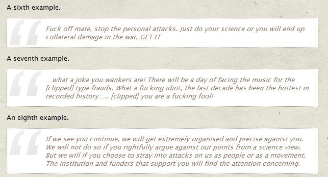 Climate sceptic commentators and bloggers have taken this decision to mean that climate scientists have not received death threats and, on the face of it, that might seem like a fair conclusion.Readfern gives excerpts from some of the emails he's seen, which are brutal and whose intent is unmistakable: